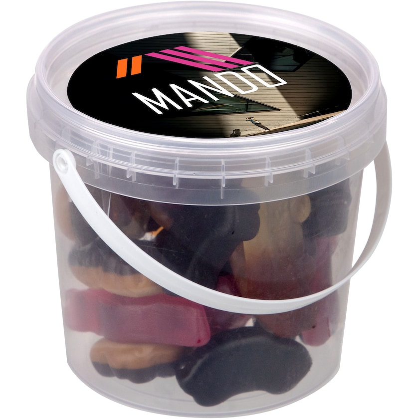Kleiner Eimer mit Lakritz mit Auto-Motiven. Die Lakritze ist in verschiedenen Geschmacksrichtungen erhältlich. Das Bedrucken erfolgt mit einem digital gedruckten Etikett auf dem Deckel des Eimers.