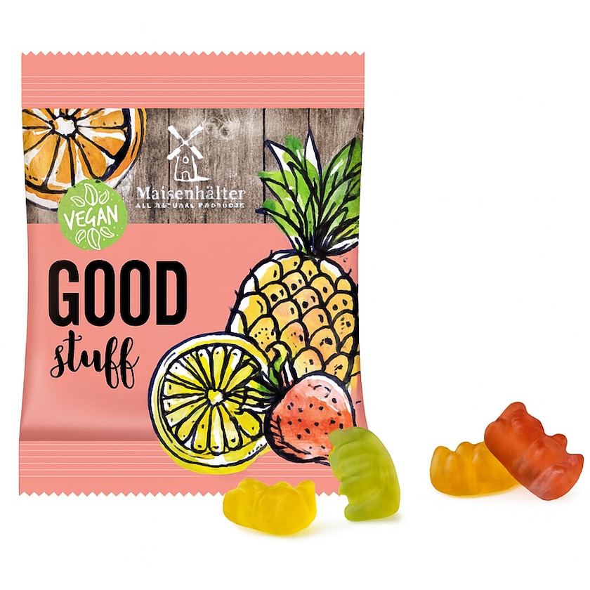 Vegane Gummibären von Trolli. Die ganze Verpackung wird nach Ihren Wünschen bedruckt. Eine perfekte Wahl, wenn Sie veganische Werbesüßigkeiten suchen.