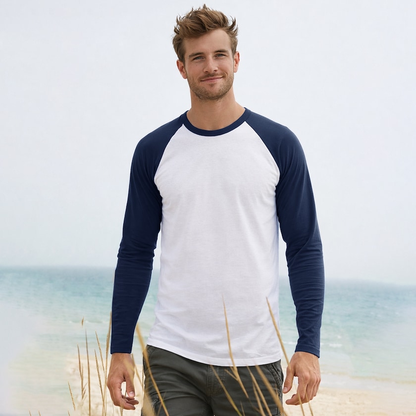 Langärmeliges Baseballshirt von Fruit of the Loom. Das T-Shirt wird in Plastikhülle verpackt geliefert.