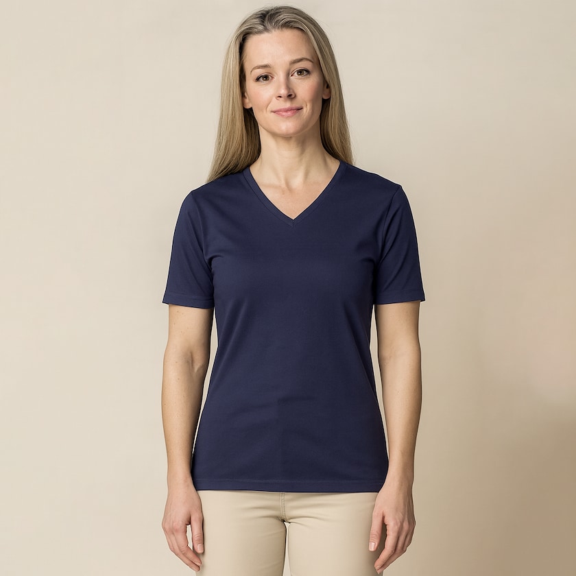 T-Shirt mit V-Ausschnitt für Damen aus Bio-Baumwolle. Der Stoff besteht aus 95% Bio-Baumwolle und 5% Elasthan, welches dem T-Shirt einen komfortablen Stretch verleiht. Gibt es auch als Herrenmodell.
