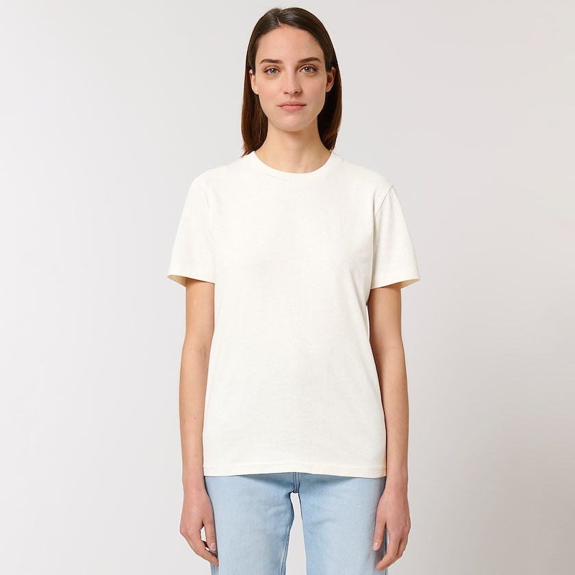 T-Shirt bedrucken mit Stoff aus recyceltem Material. Der Stoff des T-Shirts besteht zu 50 % aus recycelter Baumwolle und zu 50 % aus Bio-Baumwolle. Das recycelte Material stammt aus der eigenen Produktion von Stanley & Stella. Der Stoff hat eine gröbere Struktur als üblich. Normale Passform.