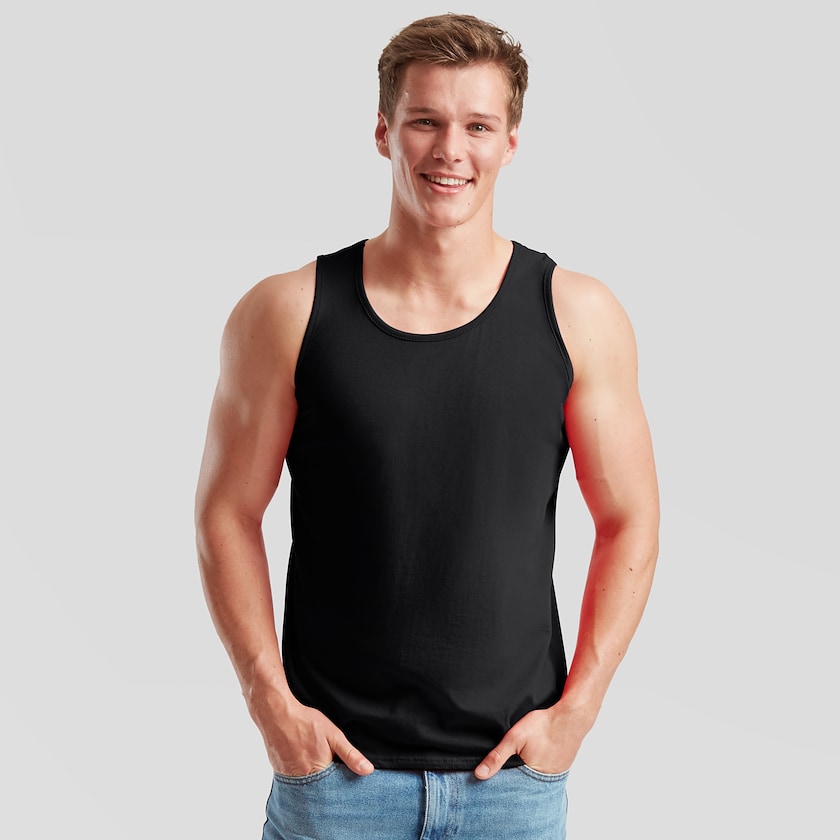 Preiswertes Tank-Top von Fruit of the Loom. Das Tank-Top wird in Plastikhülle verpackt geliefert. Gibt es auch als Damenmodell.