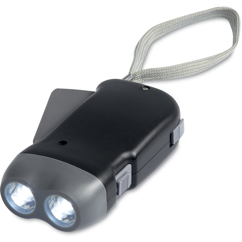 Handbetriebene Taschenlampe mit 2 LED-Lampen. Die Taschenlampe ist mit einem praktischen Handgelenkriemen versehen. Batterien sind nicht notwendig, da die Lampe per Hand betrieben wird.