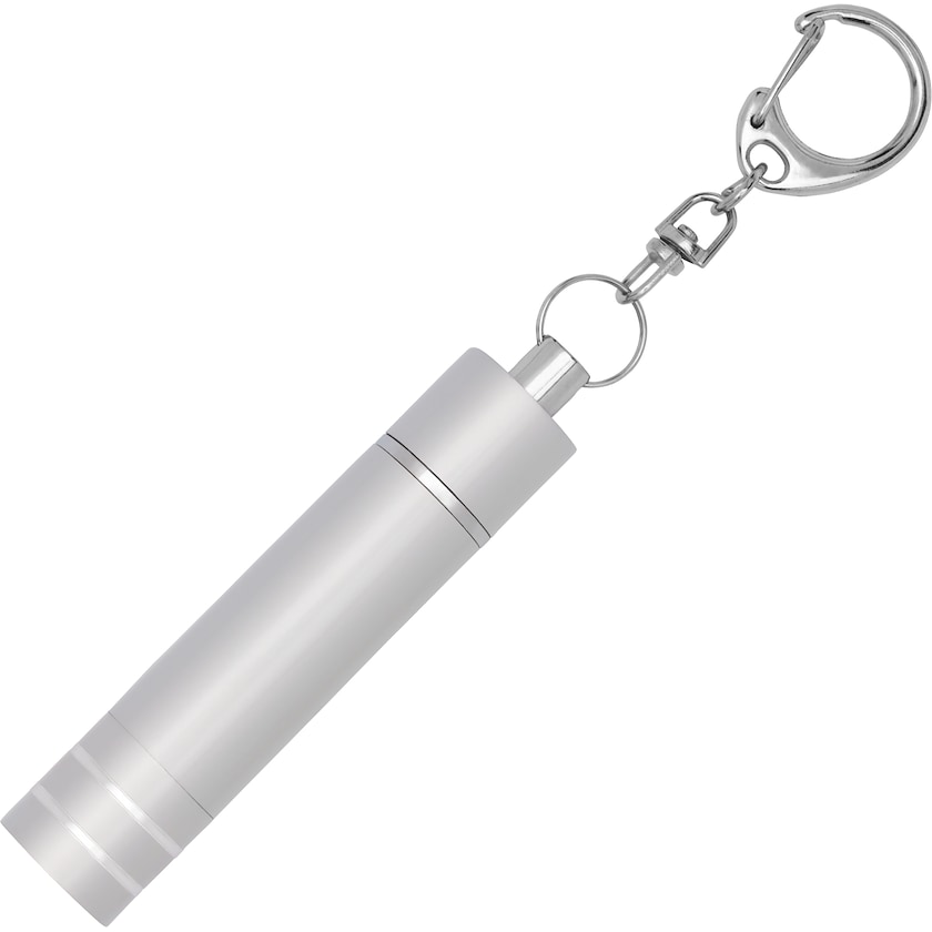 Schlüsselanhänger mit LED-Lampe. Die Lampe lässt sich herausziehen und spendet so zusätzliches Licht. Batterien enthalten. Die Beschriftung erfolgt mit Druck- oder Lasergravur.