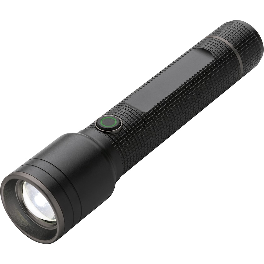 Exklusive Taschenlampe aus recyceltem Aluminium. Die Taschenlampe ist über eine USB-Buchse wiederaufladbar, hat eine Leistung von 800 Lumen und einen Lichtstrahl, der bis zu 500 Meter weit reicht. Das Licht hat fünf Modi. Die Taschenlampe kann mit einer Ladung 8 Stunden lang verwendet werden. Dank der IP4-Zertifizierung kann die Taschenlampe problemlos im Freien verwendet werden.