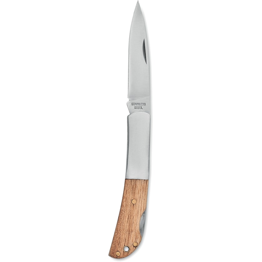 Taschenmesser aus Edelstahl und Griff aus Akazienholz. Die Klingenlänge beträgt 6 cm.