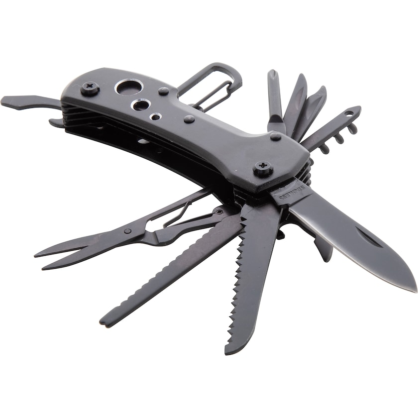 Vollkommen schwarzes Taschenmesser mit 13 Funktionen. Der Elburn ist aus rostfreiem Stahl gefertigt, mit Ausnahme des Griffs, der aus Aluminium besteht. Die Beschriftung kann entweder durch Lasergravur oder 2-farbigen Druck erfolgen.