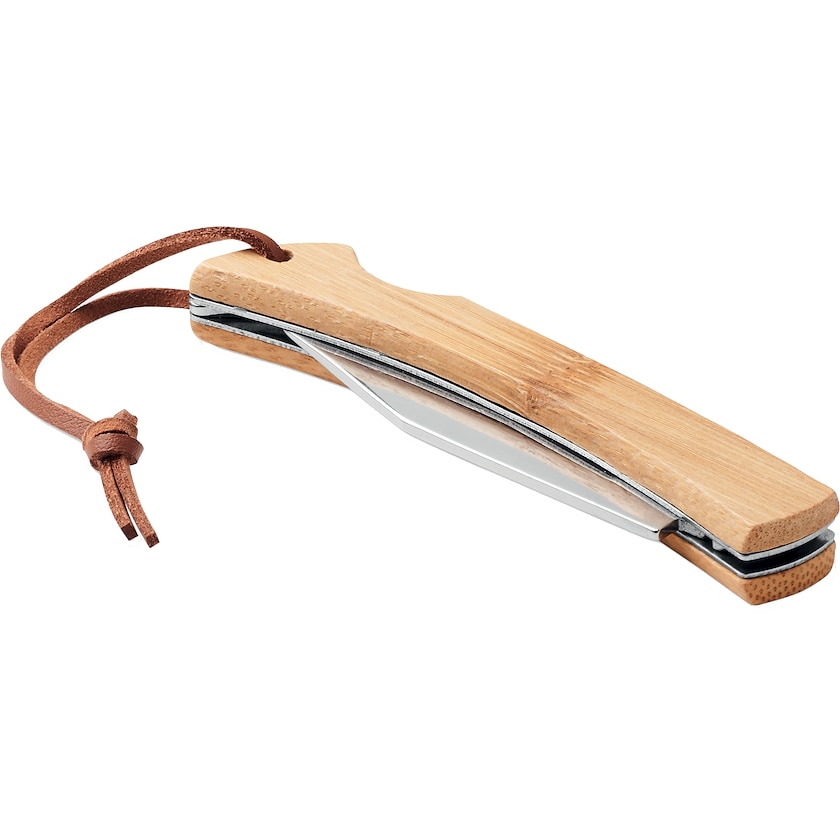 Taschenmesser aus Edelstahl und Bambus. Perfekt für Camping oder Ausflüge in die Natur.
