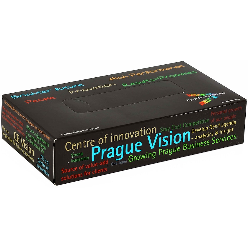 Karton mit 100 Tüchern. Die Taschentücher bestehen aus zwei Schichten und bestehen vollständig aus Zellulose. Der gesamte Karton wird nach Ihren Wünschen bedruckt.
