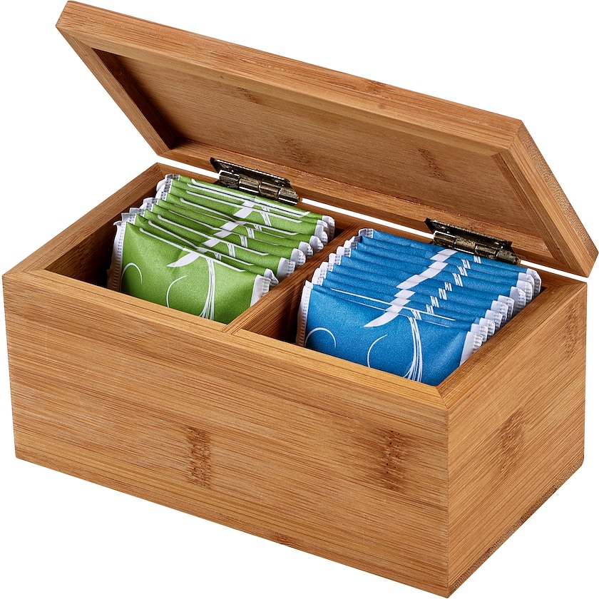 Kleine Teebox aus Bambus gefüllt mit leckerem Tee. Die Teebox besteht aus zwei Fächern und der Deckel wird mit einem Magnetverschluss verschlossen. Die Box enthält 20 Teebeutel Gorreana Azorentee, 10 Teebeutel schwarzen Tee und 10 Teebeutel grünen Tee. Lieferung im naturfarbenen Karton. Die Kennzeichnung erfolgt mit Lasergravur oder 1-farbigem Druck.