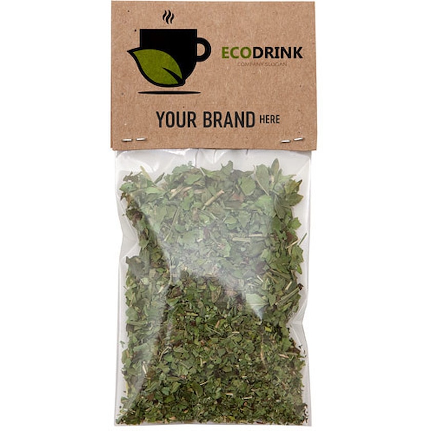 Teebeutel mit Bio-Tee. Der Teebeutel hat ein naturfarbenes Kartonetikett, das nach Ihren Wünschen bedruckt wird. Wählen Sie zwischen zwei verschiedenen Teesorten. Ausreichend für drei Teeaufgüsse.