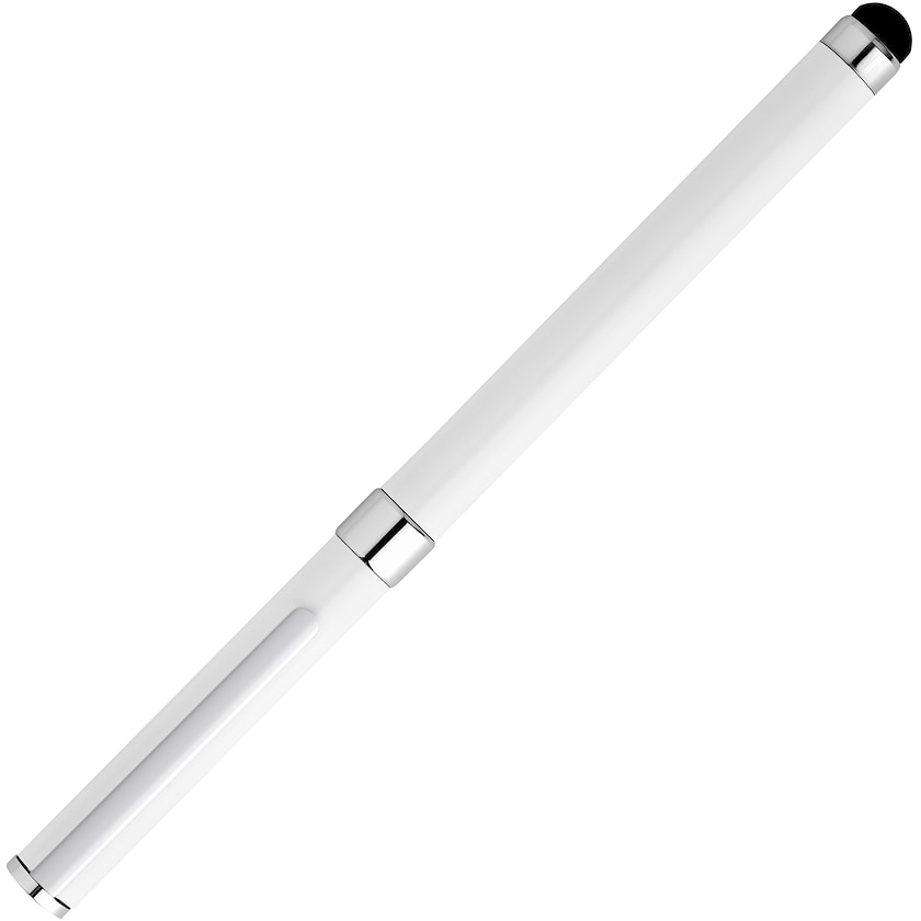 Touchpen aus Metall mit Chromdetails. Der Stift hat schwarze Tinte. Die Kennzeichnung kann wahlweise mit Druck oder Lasergravur erfolgen.