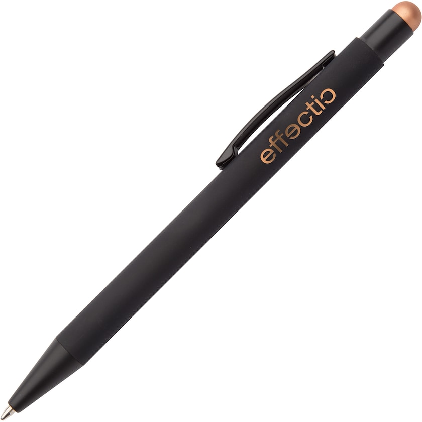 Schwarzer Touchpen mit farbig erscheinender Lasergravur. Wenn der Stift gelasert wird, erscheint das Motiv in der gleichen Farbe wie der Touchpen. Der Kugelschreiber ist aus Aluminium und hat eine blaue Tinte.