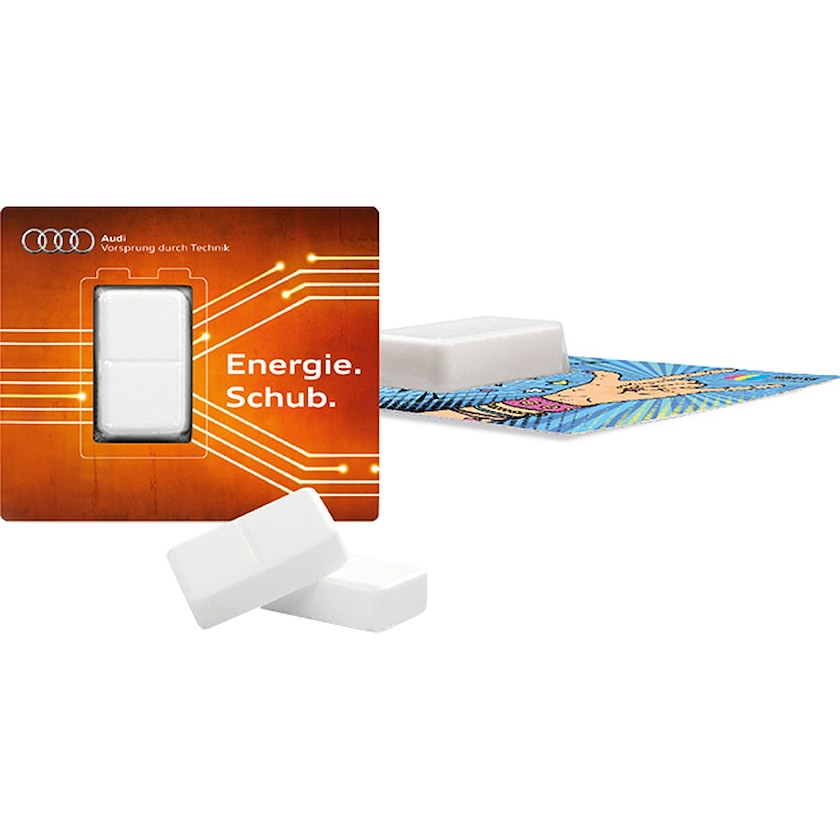 Kommt gut an. Eine Werbekarte voller Energie! Die Karte enthält Traubenzucker mit viel Vitamin C. Die Karte wird mit 4-Farbdruck versehen.