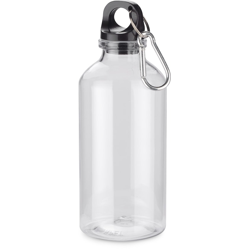 Transparente Wasserflasche aus recyceltem Kunststoff. Alameda hat ein geringes Gewicht und ist mit einem Karabiner ausgestattet, sodass es beispielsweise an einem Rucksack befestigt werden kann.