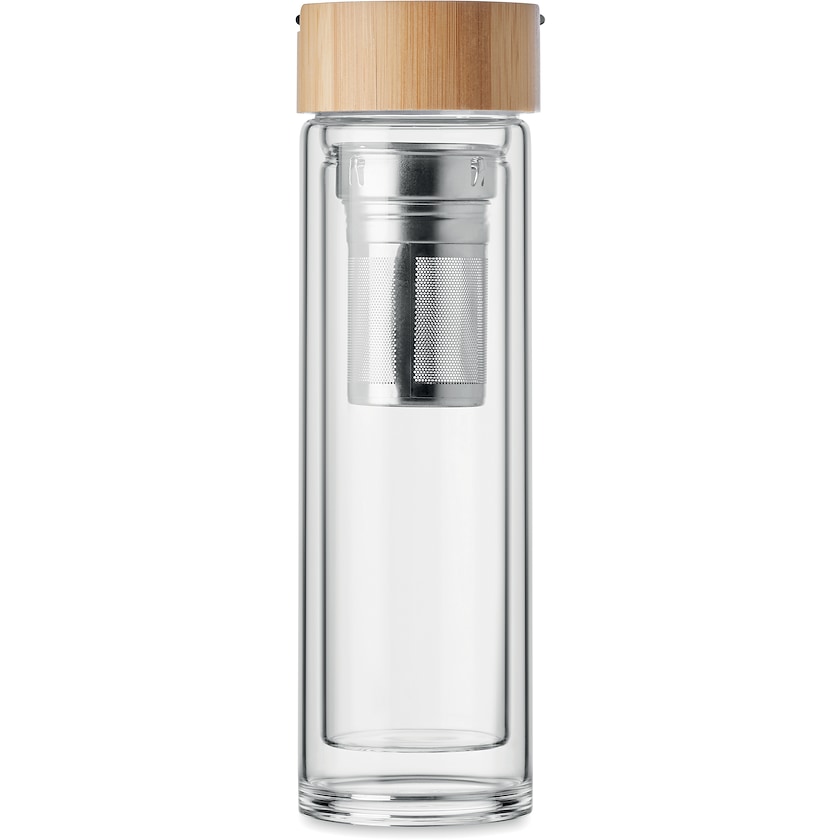 Wasserflasche aus Borosilikatglas mit Tee-Ei. Dank Borosilikatglas ist die Wasserflasche sehr langlebig. Der Deckel ist aus Bambus. Die Flasche ist doppelwandig, wodurch Heißgetränke länger warm gehalten werden. Beim 1-farbigen Druck beträgt die Druckfläche ganze 180 x 110 mm.