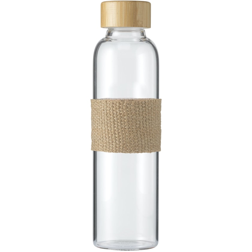 Trinkflasche aus strapazierfähigem Borosilikatglas. Die Trinkflasche ist mit einem Bambusdeckel versehen und absolut auslaufsicher. Wenn der Deckel entfernt wird, kann die Flasche in der Spülmaschine gewaschen werden. Die Lieferung erfolgt einzeln verpackt in einem braunen Karton. Der Druck kann mit maximal zwei Farben erfolgen.