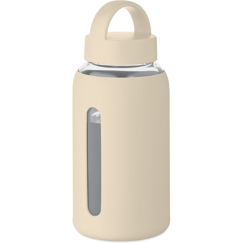 Wasserflasche aus Glas mit schützender Silikonhülle. Der Deckel ist mit einem integriertem Griff versehen.
