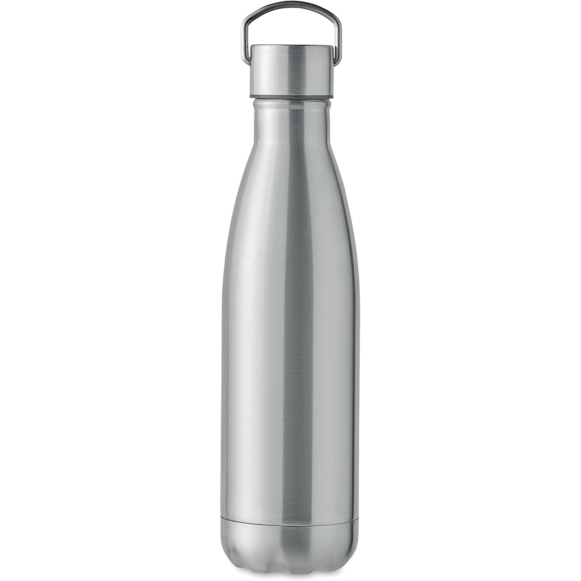 Thermoflasche aus recyceltem Edelstahl. Die Thermosflasche besteht zu 90% aus recyceltem rostfreiem Edelstahl und zu 10% aus rostfreiem Stahl. Der Deckel ist mit einem Griff ausgestattet. Auslaufsicher.