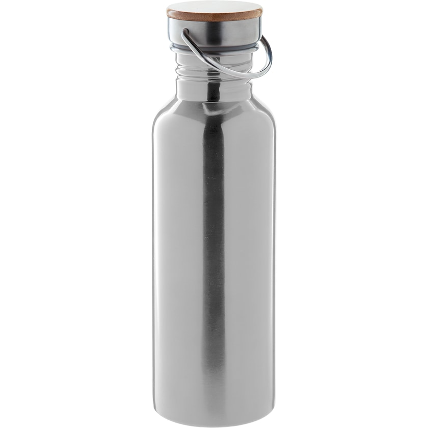 Trinkflasche aus Edelstahl mit praktischer Trageschlaufe am Deckel. Die Oberseite des Deckels ist aus schönem Bambus. Die Kennzeichnung kann wahlweise mit Druck oder Lasergravur erfolgen.