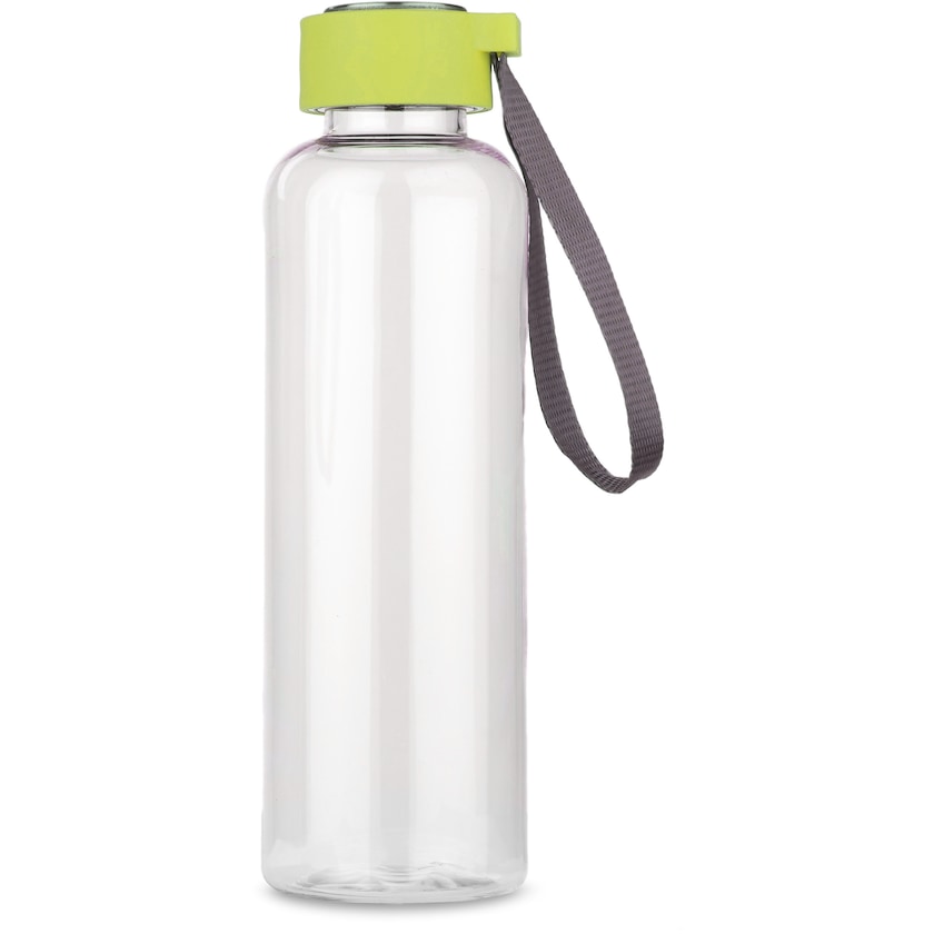 BPA-freie Trinkflasche mit Trageriemen im Verschluss. Das Logo wird in den Metallteil des Verschlusses eingelasert.