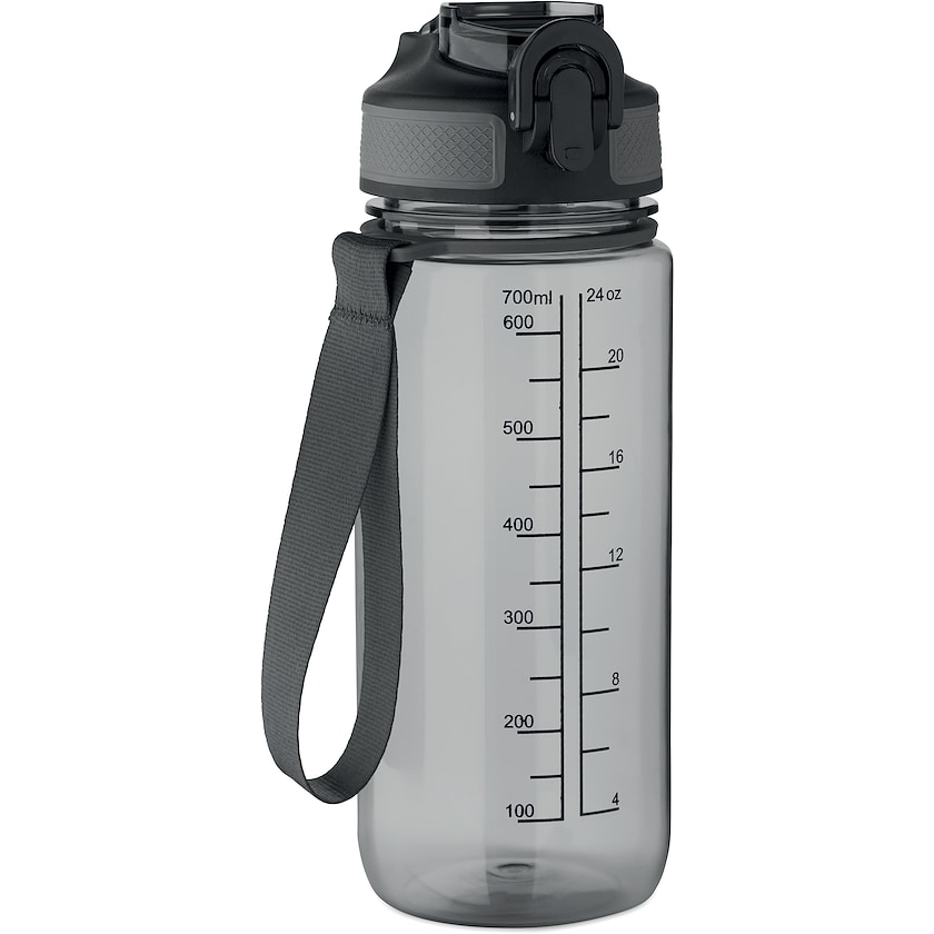 Umweltfreundliche Wasserflasche mit aufgedruckten Volumenangaben. Der Verschluss lässt sich mit einer Hand öffnen und ist auslaufsicher.