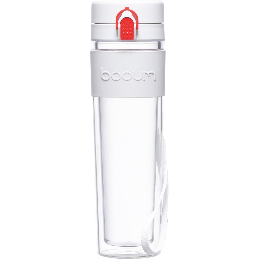 Wasserflasche mit doppelten Wänden von Bodum. Die Doppelwände halten kalte Getränke länger kalt. Ein Druckknopf verriegelt den Deckel, um ein versehentliches Öffnen zu verhindern. Kann in der Spülmaschine gewaschen werden. Es ist nur 1-farbiger Druck möglich.