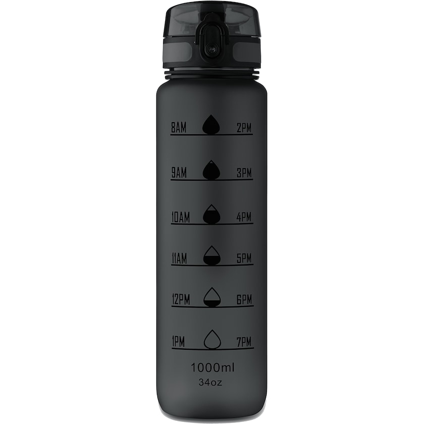 Wasserflasche aus rPET mit Zeitmarkierungen. Der Verschluss ist mit einer Sicherheitsverriegelung versehen und kann mit einer Hand geöffnet werden. Auslaufsicher.