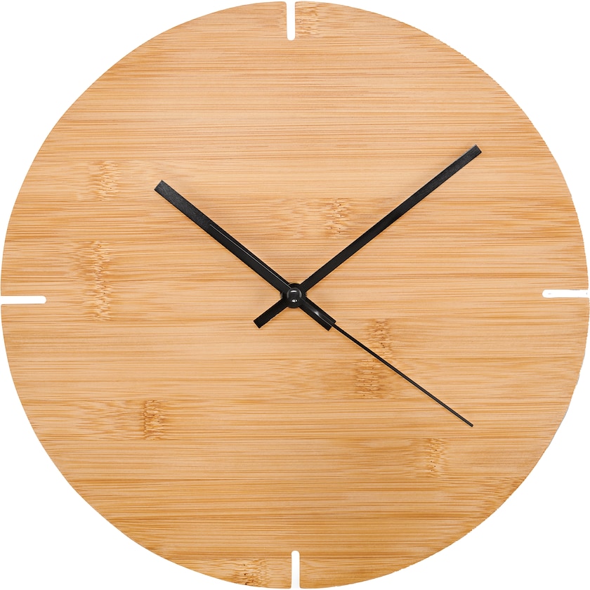 Wanduhr aus Bambus. Die Uhr wird mit einer AA-Batterie (nicht im LIeferumfang enthalten) betrieben. Die Markierung erfolgt mittels Lasergravur.