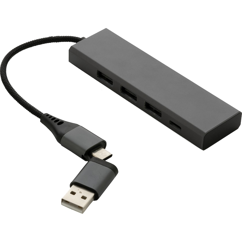Umweltfreundlicher USB-Hub aus recyceltem Material. Campton besteht aus recyceltem Aluminium, ABS, TPE und PET. Der USB-Hub ist mit drei USB-A-2.0-Anschlüssen und einem Typ-C-Anschluss ausgestattet. Das Kabel ist 10 cm lang. Geliefert in einer Geschenkbox aus FSC-zertifiziertem Papier.