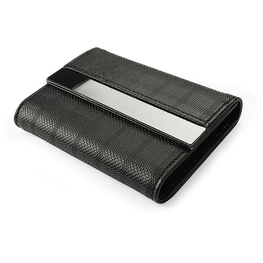 Elegante Visitenkartenhülle aus Kunstleder. Platz für bis zu 20 Karten. Markierung mit Lasergravur auf der Metallplatte auf der Vorderseite.