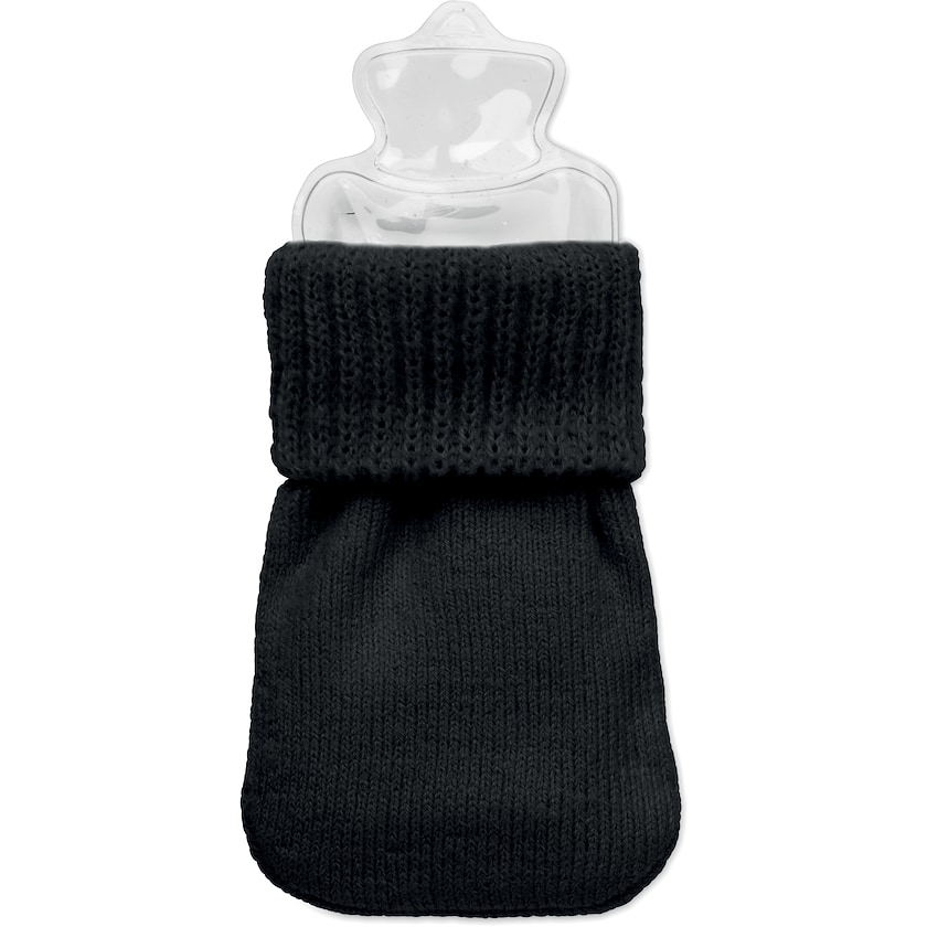 Heatpack in gestrickter Tasche. Das Heatpack wird durch Drücken der Metallplatte auf der Innenseite aktiviert. Es wird durch Einlegen in warmes Wasser reaktiviert.