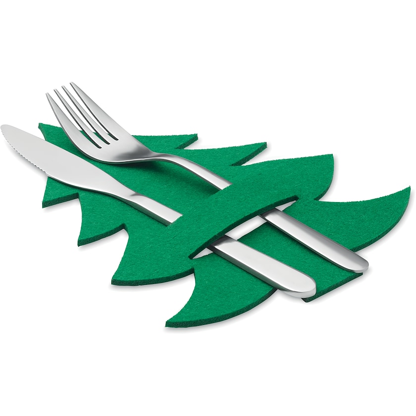 Set mit 4 Besteckhaltern in Form eines Weihnachtsbaums. Die Besteckhalter bestehen aus rPET, also recycelten PET-Flaschen. Auf der Rückseite der Besteckhalter befindet sich ein vorgedrucktes Symbol, das anzeigt, dass sie aus rPET bestehen. Schmückt jeden Weihnachtstisch!