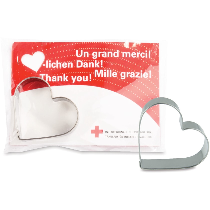 Herzförmige Ausstechform in Polybeutel mit einer im 4-Farbfotodruck bedruckten Pappe. Die Pappe wird beidseitig bedruckt. Ein herzliches Werbeprodukt mit großer Werbung!