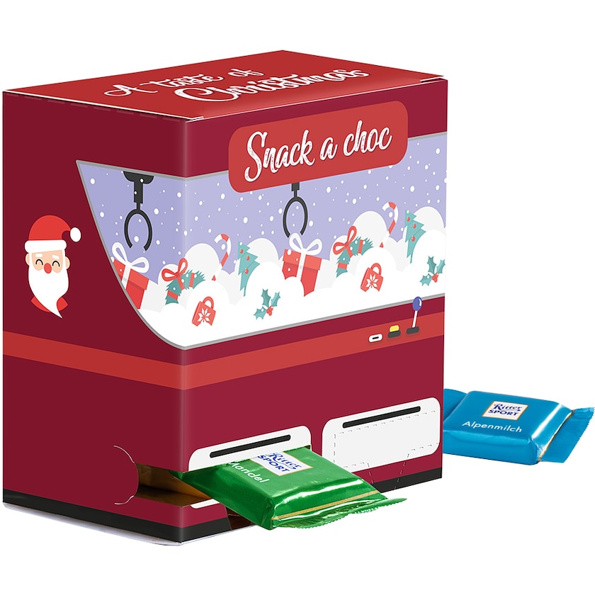 Innovativer Adventskalender gefüllt mit Schokolade von Ritter Sport. Dieser Adventskalender hat keine nummerierten Türen, stattdessen entnehmen Sie 24 Tage lang täglich nur ein Stück Schokolade von Ritter Sport. Der Adventskalender besteht zu 100 % aus FSC-zertifiziertem Karton.