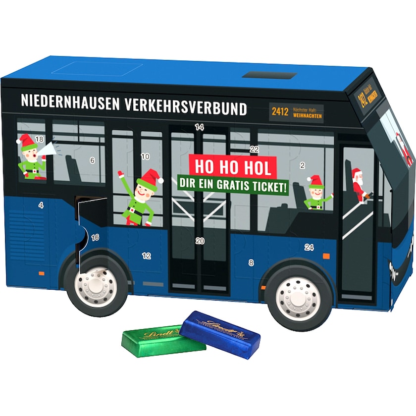 Einzigartiger Adventskalender mit hochwertiger Lindt-Schokolade. Gefüllt mit Lindt-Schokolade (Milchschokolade). Die Schokoladenstücke sind in drei verschiedenen Folienfarben erhältlich. Der Favorit aller Busfahrer – perfekt für die Transportbranche.