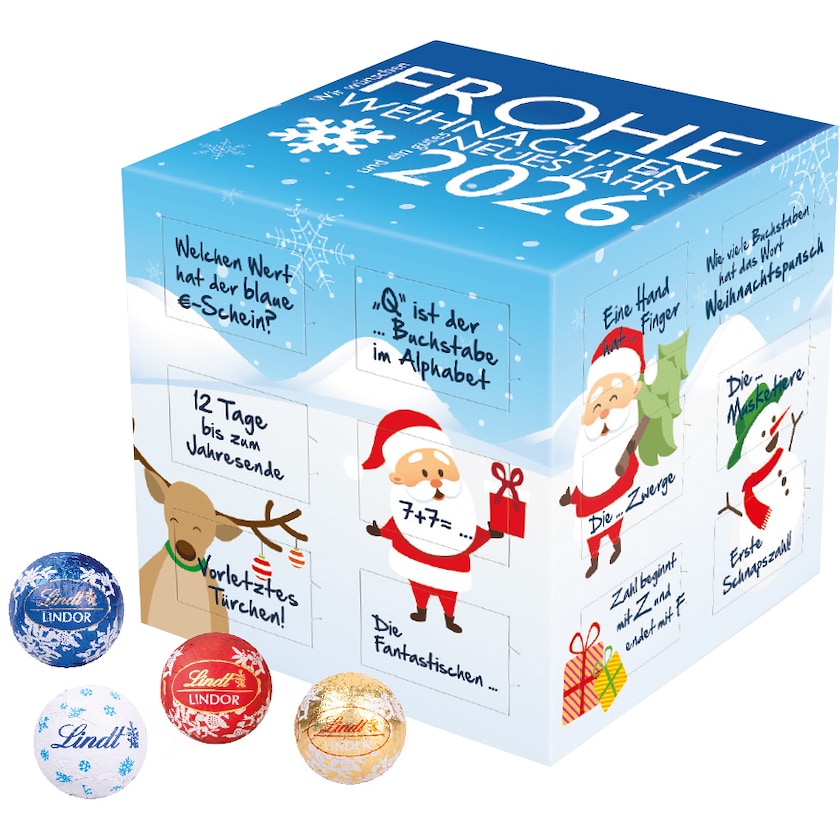 Kubischer Adventskalender, komplett aus Papier. Der Adventskalender ist mit köstlichen Lindt Lindor Kugeln gefüllt. Er enthält kein Plastik und ist daher eine gute Wahl für die Umwelt. Das verwendete Papier stammt aus FSC-zertifizierten Wäldern.