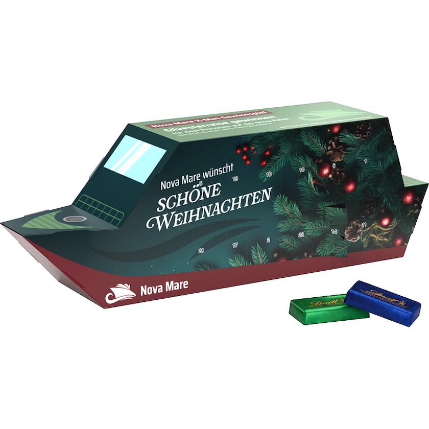 Lindt Adventskalender in Schiff-Form. Gefüllt mit Lindt-Schokolade (Milchschokolade). Die Schokoladenstücke sind in drei verschiedenen Folienfarben erhältlich.
