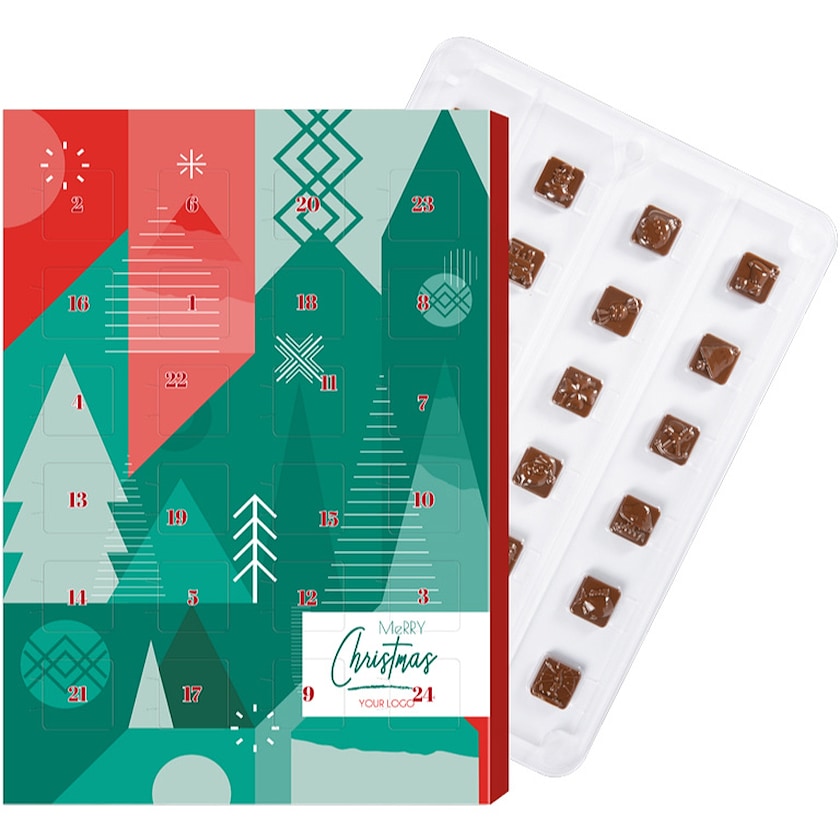 Schokoladenkalender mit 4-Farbendruck im etwas kleineren Format. Adventskalender beinhaltet 24 Schokolädchen aus Zartbitter- oder Vollmilchschokolade.
