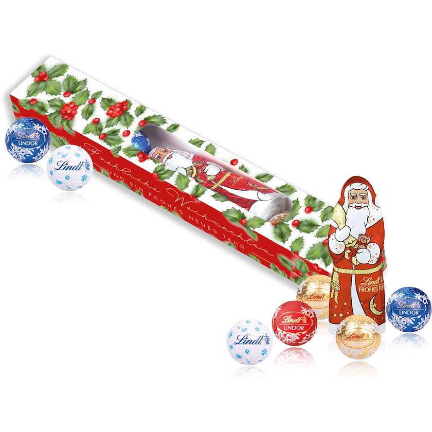 Schokoladenschachtel mit Pralinen und Schokoladen-Weihnachtsmann von Lindt. Lindt Christmas Parade enthält 5 Lindt Minis (ca. 22 Gramm) und 1 Lindt Chocolate Santa (ca. 10 Gramm). Die Schachtel wird ganz nach Ihren Wünschen bedruckt.