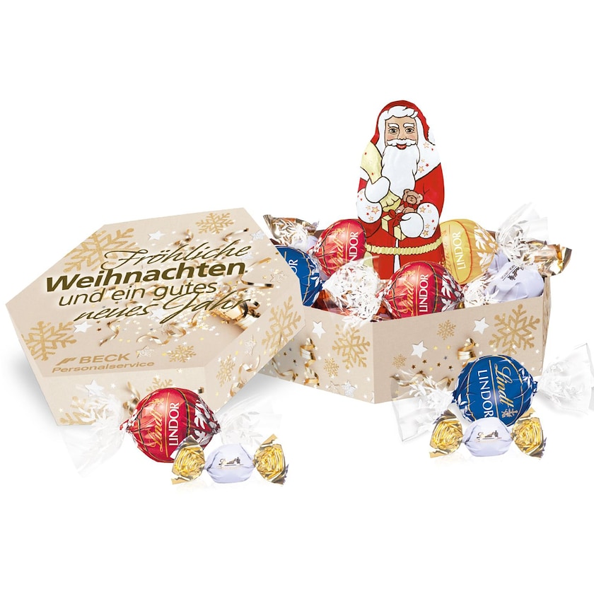 Schokoladenschachtel mit luxeriöser Schokolade von Lindt. Lindt Christmas Maxi Box enthält 5 Lindt Lindor, 5 Lindt Milchschokoladenkugeln und 1 Lindt Weihnachtsmann. Ein perfektes Weihnachtsgeschenk für Ihre wichtigen Kunden. Die gesamte Schachtel wird nach Ihren Wünschen bedruckt.