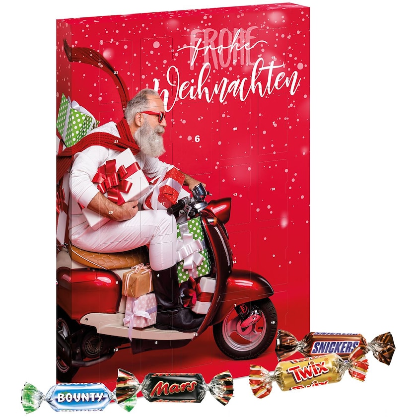 Schokoladenkalender gefüllt mit Mars, Snickers, Bounty und Twix. Eine wunderbare Schokoladenmischung, die von allen geliebt wird! Der gesamte Kalender wird nach Ihren Wünschen bedruckt.