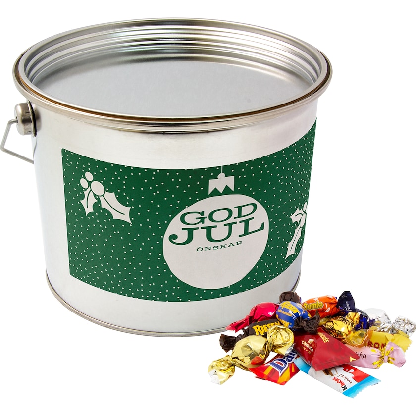 Blecheimerchen, gefüllt mit beliebten Markensüßigkeiten. Beinhaltet u.a. Dumle, Fazer Blå, Snickers, Mars, Twix und englische Karamellbonbons. Mit selbstgestaltetem 4-Farbdruck Etikett am Eimer.