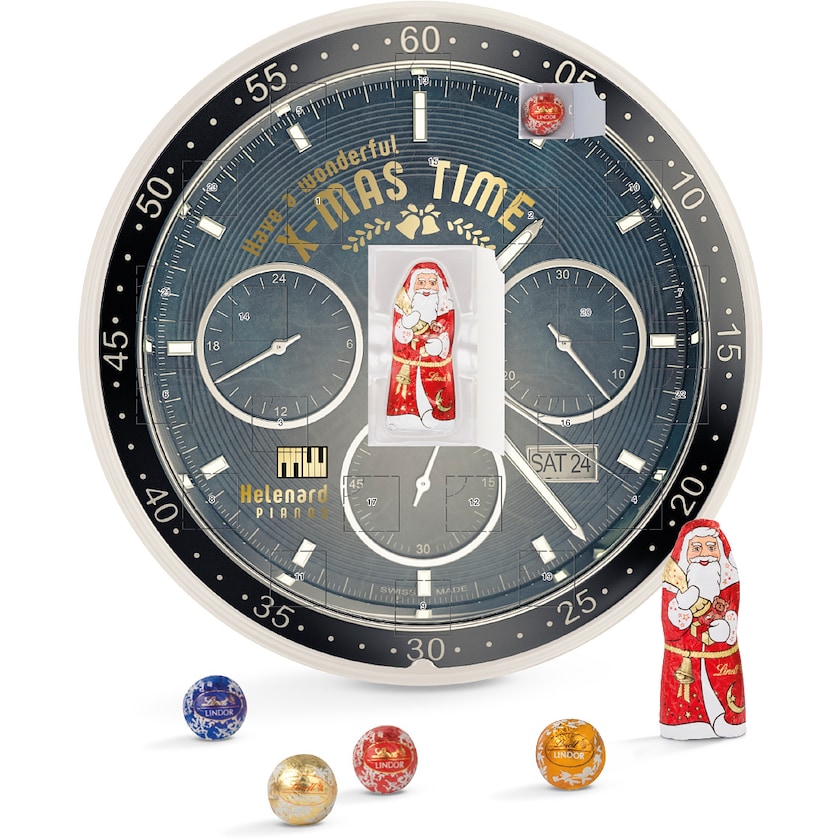 Runder Adventskalender gefüllt mit exklusiver Schokolade von Lindt. Enthält 23 Schokoladenkugeln und einen Schokoladen-Weihnachtsmann. Der Karton ist FSC-zertifiziert und die Einlage kompostierbar. Die gesamte Produktion ist zu 100 % klimaneutral.