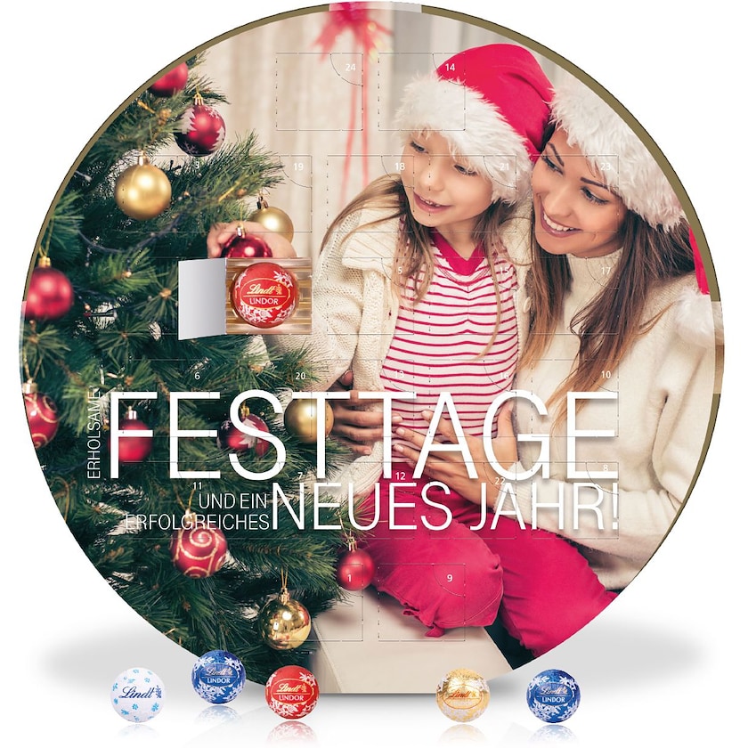 Runder Adventskalender gefüllt mit 24 Lindt Minis. Der Adventskalender besteht aus FSC-zertifiziertem Karton, der komplett klimaneutral hergestellt wird. Laden Sie die Druckvorlage herunter und erstellen Sie Ihren einzigartigen Adventskalender.