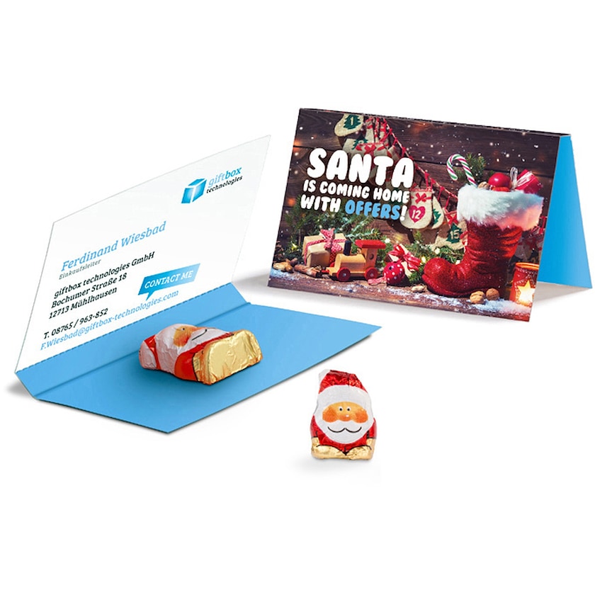 Schokoladenweihnachtsmann mit Weihnachtskarte, die nach Ihren Wünschen bedruckt wird. Laden Sie die Druckvorlage runter und erstellen Sie Ihren persönlichen Weihnachtsgruß.