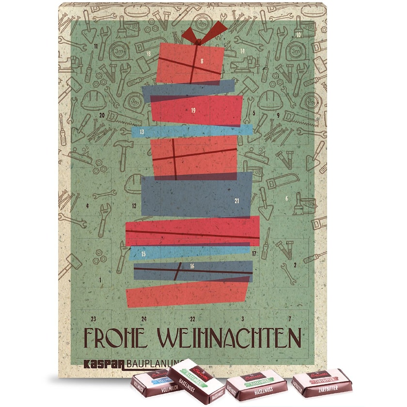 Adventskalender aus Fairtrade-zertifizierter Schokolade von Sarotti. Die Außenhülle des Kalenders besteht aus umweltfreundlichem Graspapier und die Einlage aus recycelbarer Pappe. Die Schokolade kommt gemischt in den Geschmacksrichtungen Vollmilch, Gianduja, Haselnuss und Zartbitter. Der Adventskalender ist zum Aufhängen an der Wand gedacht.