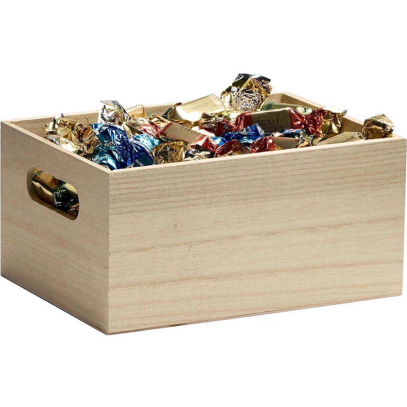 Kleine Holzkiste mit 1 kg einer italienischen Pralinenmischung gefüllt. Eine Weihnachtskarte mit Ihrem persönlichen Weihnachtsgruß ist im Preis inbegriffen.