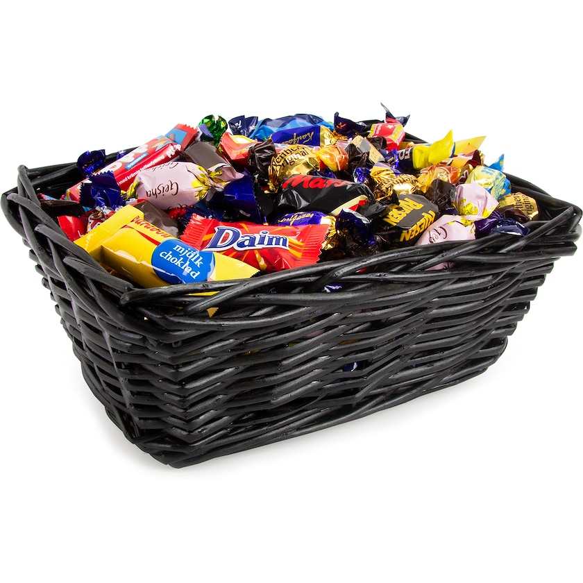 Schwarzer Korb mit eingewickelten Qualitätsbonbons. Enthält Klassiker wie Toblerone, Dumle, Geisha und Daim. Wenn Sie möchten, können Sie dem Korb eine Grußkarte zum Thema Weihnachten hinzufügen.