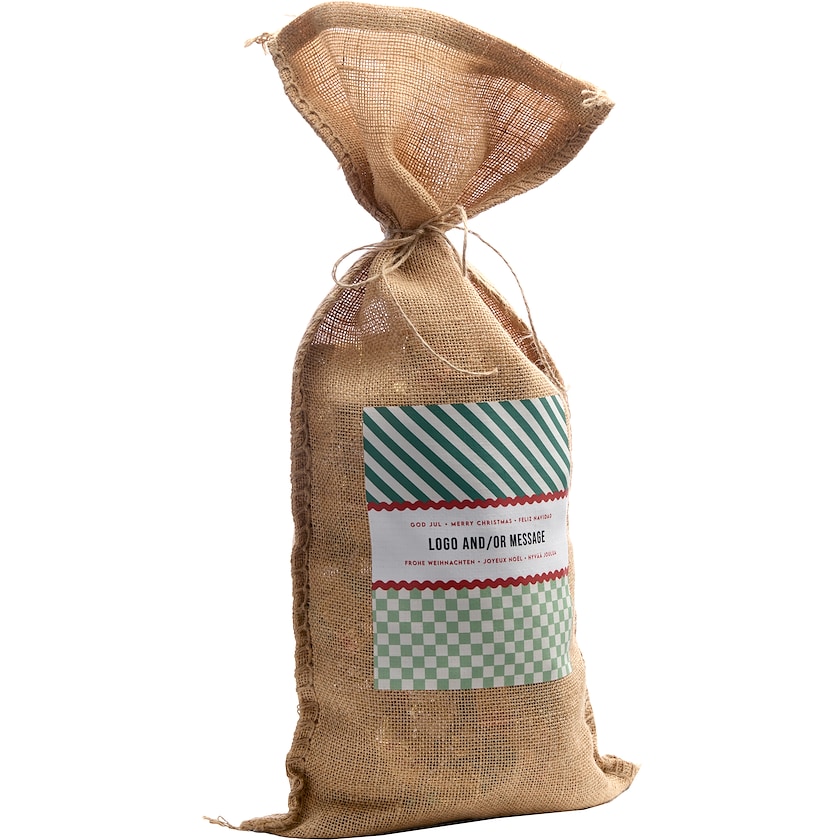Großer Weihnachtssack aus Jute mit 3 kg Weihnachtssüßigkeiten Ihrer Wahl. Die Süßigkeiten sind in den Geschmacksrichtungen italienische Pralinenmischung, schokoladenüberzogene Karamellmischung, Weihnachts-Baiser und Weihnachtskaramellen-Mischung erhältlich. Der Weihnachtssack lässt sich mit Ihrem Druck versehen. Ein beliebtes Weihnachtsgeschenk für Kunden und Mitarbeiter.